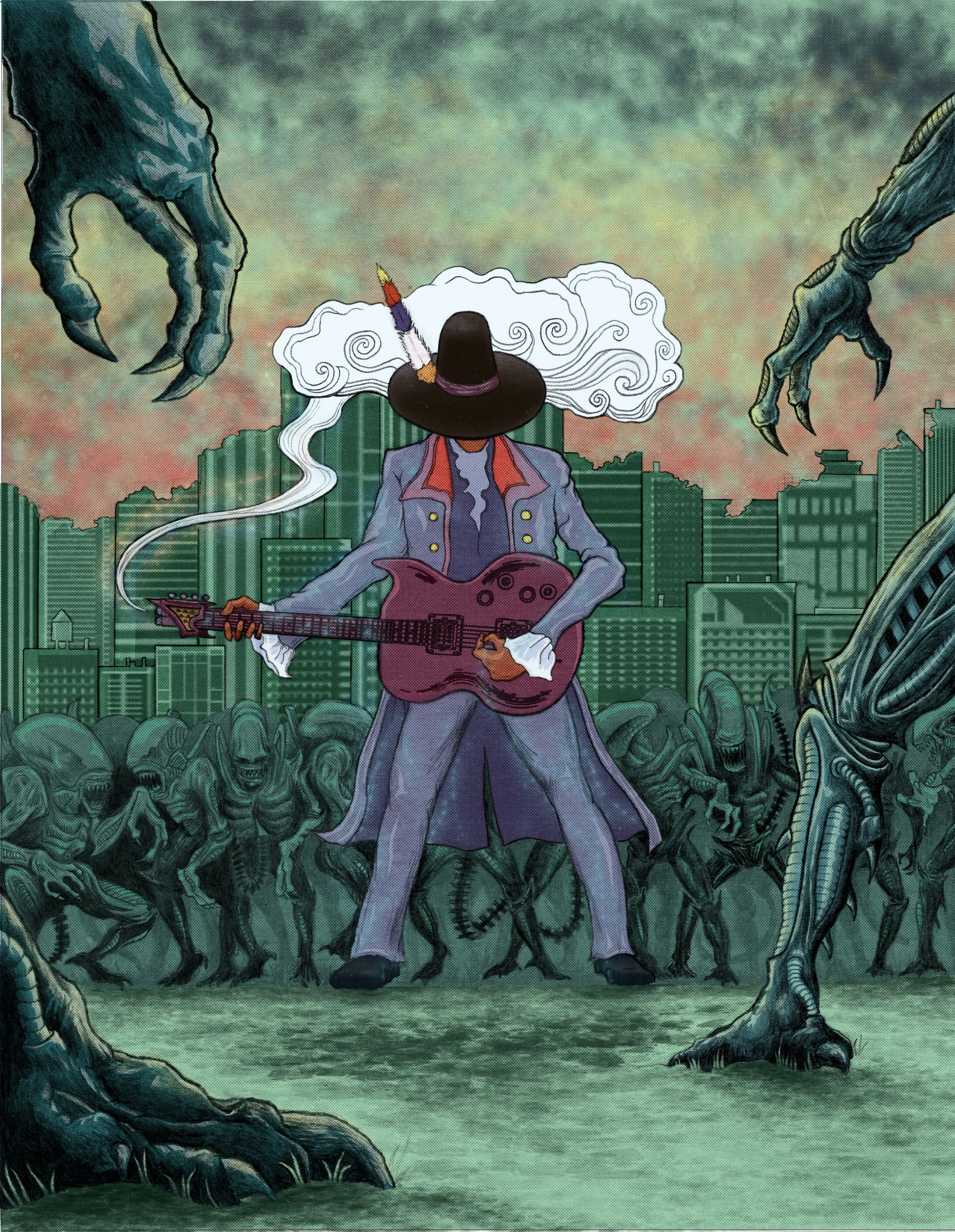 Jimi Hendrix in the future fighting in an alien invasion. Graphite and ink and colored digitally.