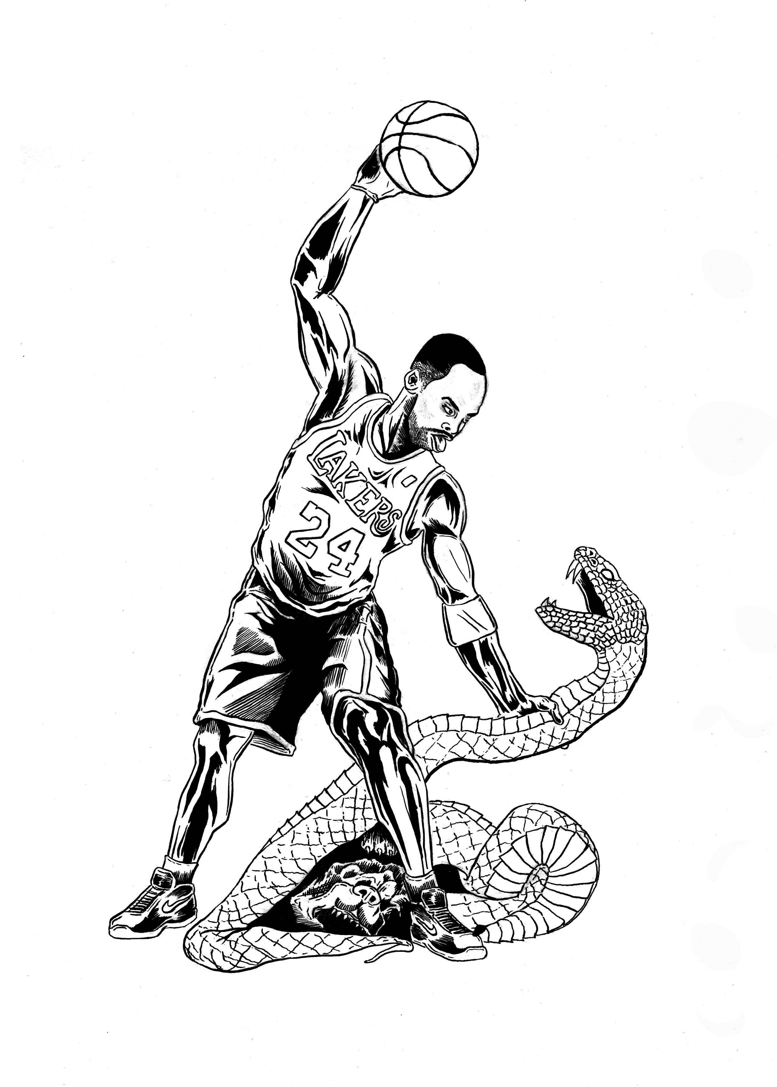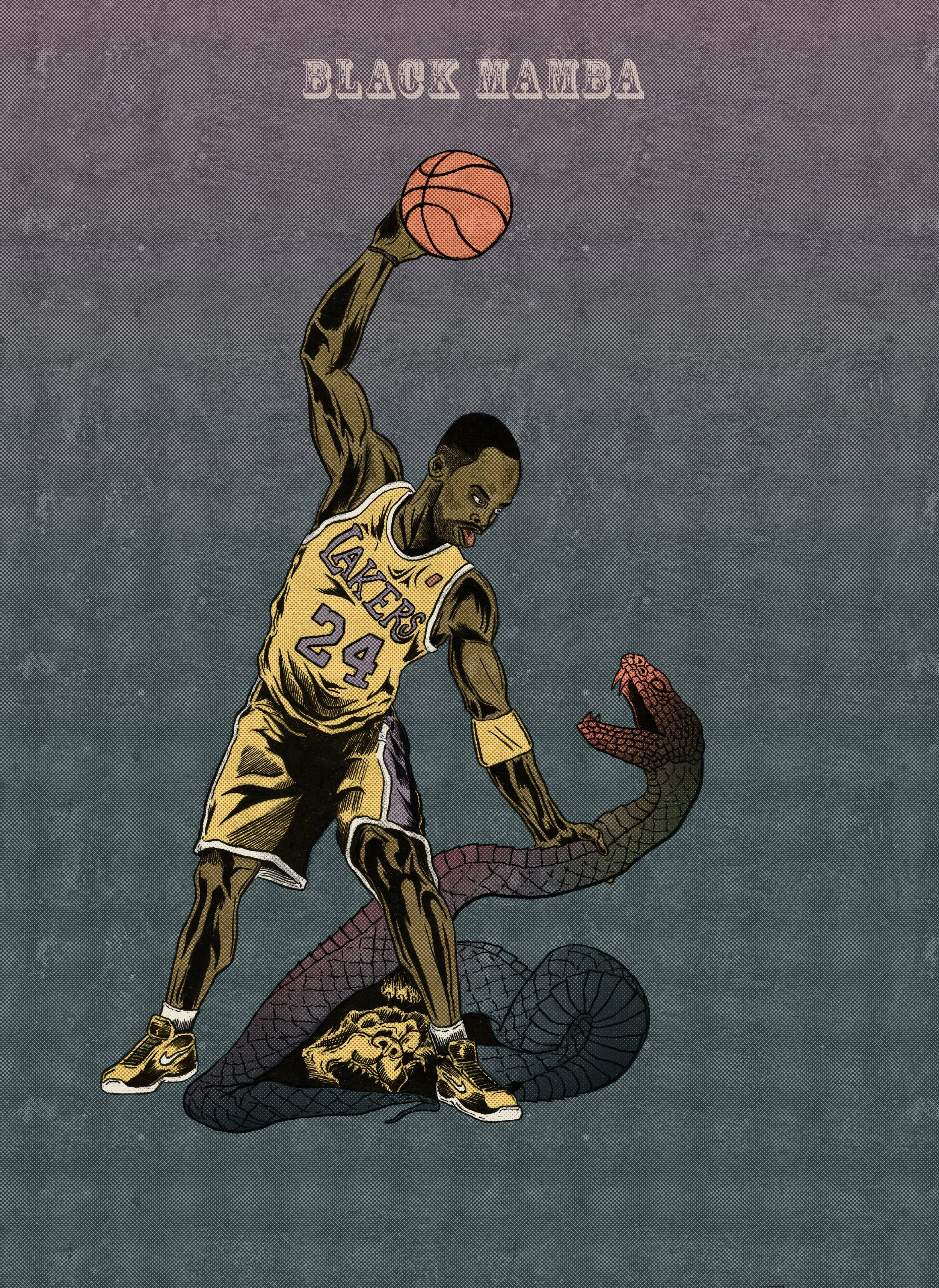 Colored digitally. The dead lion skin intertwined in the mamba symbolizes Kobe’s greatness over Lebron James.